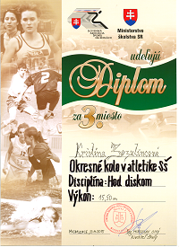 OKRESNÉ KOLO V ATLETIKE SŠ 4. základná škola bola dejiskom zápolenia okresného kola študentov a študentiek stredných škôl v ľahkej atletike. Študenti našej školy sa nestratili a priniesli domov cenné kovy. Najúspešnejším bol Patrik Chimaľ, ktorý vyhral disciplínu šprint na 200 metrov a postúpil do krajského kola, kde bude naše mesto reprezentovať. Darilo sa mu aj v disciplíne skok do diaľky, kde obsadil 3 miesto. Úspešné boli aj naše dievčatá, Kristína Zozulinecová obsadila 3. miesto v hode diskom, rovnako 3. miesto zaznamenala aj Simona Švajková v disciplíne beh na 800 metrov. Srdečne blahoželáme.