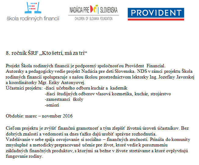 8. september - Deň finančnej gramotnosti „Čo sa v mladosti naučíš, na starobu akoby si našiel,“ takto znie jedno z najznámejších slovenských porekadiel. V otázkach financií platí táto múdrosť obzvlášť. Na vlastnej koži si to overili žiaci našej školy, ktorí sa zapojili do finančnej vedomostnej súťaže „FINANČNÁ GRAMOTNOSŤ“. Najšikovnejší z nich – M. Kužma , T. Bruňo, G. Poláková, T. Katová, A. Sabovčíková a B. Jakubová okrem vecných cien získali aj sladké odmeny.