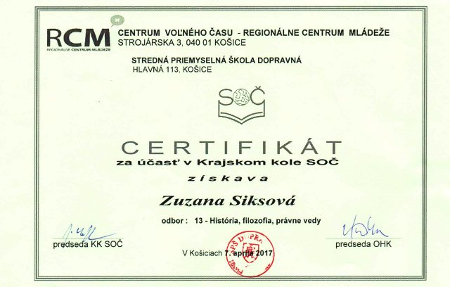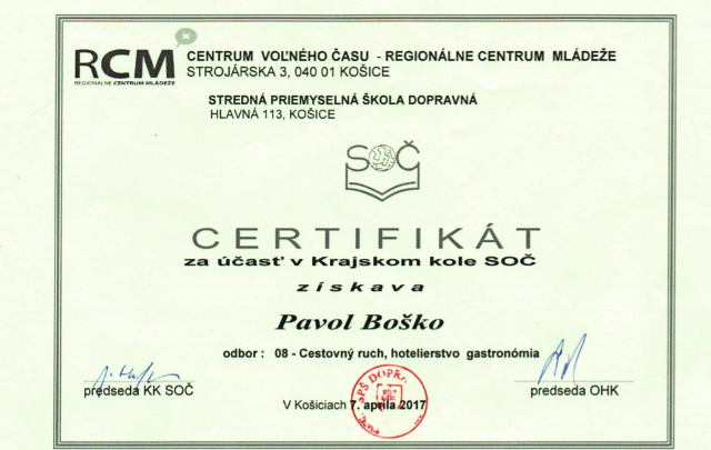 KRAJSKÉ KOLO SOČ 7. apríla 2017 sa v SOŠ dopravnej v Košiciach uskutočnilo krajské kolo 39. ročníka SOČ. Z našej školy sa tento rok prebojovali do krajského kola 3 súťažiaci v dvoch odboroch: 08 Cestovný ruch, hotelierstvo, gastronómia: Pavol Boško, 13 História, politológia, filozofia a právne vedy: Milan Berta a Zuzana Siksová. Konkurencia z celého kraja bola vo všetkých odboroch veľká. Aj keď žiaci nepostúpili do celoštátneho kola, za reprezentáciu školy ďakujeme.
