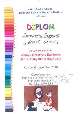RUSKÝ FILM V ŠKOLE Do 14. ročníka súťaže Ruský film v škole sa zapojilo 27 škôl, spolu bolo zaslaných viac ako 150 výtvarných prác. Odborná porota teda mala z čoho vyberať, v takejto silnej konkurencii sa umiestnili aj žiačky našej školy. Sarah Jevčiková získala 1. miesto, Lucia Hašková 2. miesto a Dominika Pappová čestné uznanie.