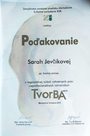 TVORBA 2019 Súťažná výstava TVORBA je v Michalovciach už roky udalosťou a tradíciou konajúcou sa v priestoroch Zemplínskeho osvetového strediska, ktoré plní úlohu organizátora súťažnej a regionálnej výstavy výtvarných prác neprofesionálnych výtvarníkov. Vyhlasovateľom celoštátnej súťaže je NOC v Bratislave. Ide o trojstupňovú súťaž, od regionálneho kola, cez krajské kolo, ktorým je Košická paleta, až po celoštátne kolo Výtvarné spektrum. Súťaž podporuje rozvoj neprofesionálnej výtvarnej tvorby od mládeže až po dospelých. Tak ako minulý rok sme sa znova zapojili do súťaže so žiačkou 3.A triedy Sarah Jevčíkovou. Za svoju účasť získala ďakovný list za tvorivý prínos.